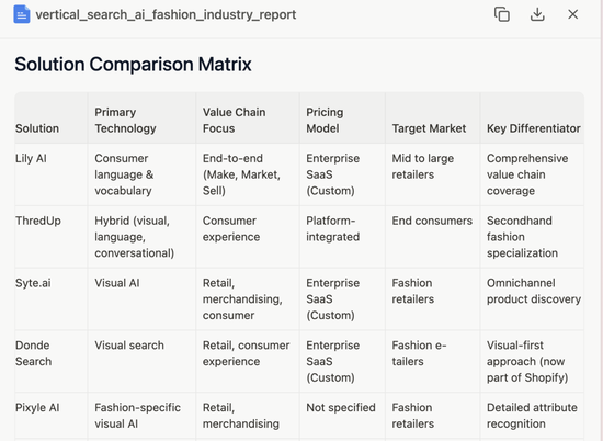 Manus 深入研究整理了服装行业的 AI 搜索产品,并进行详尽的产品分析
