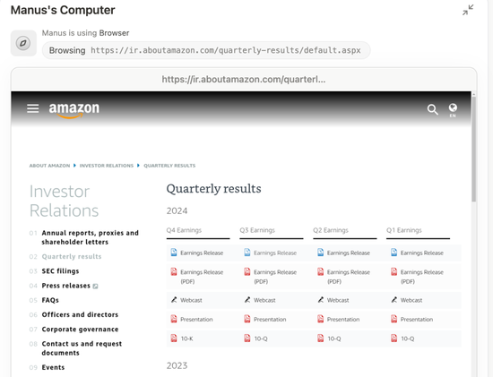 Manus 通过资料研究、数据分析捕捉了过去四个季度市场对 Amazon 的情绪变化。