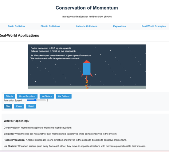 我是一名中学物理老师,正准备教授动量守恒定律。您能否创建一系列清晰准确的演示动画,并将它们整理成一个简单的 HTML 演示文稿?
