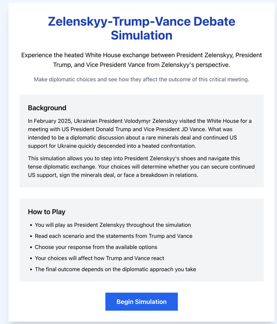 Manus 为你定制个性化的小游戏。来试试泽连斯基白宫论战模拟器